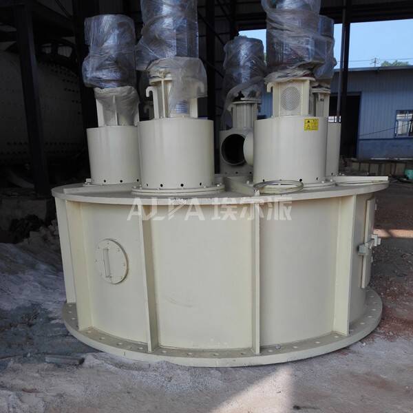 分級機與旋風(fēng)分離器、除塵器、引風(fēng)機組成一套分級系統(tǒng)。物料在風(fēng)機抽力作用下由分級機下端入料口隨上升氣流高速運動至分級區(qū),在高速旋轉(zhuǎn)的分級渦輪產(chǎn)生的強大離心力作用下,使物料分離,符合粒徑要求的細(xì)顆粒通過分級輪葉片間隙進入旋風(fēng)分離器或除塵器收集。粗顆粒夾帶部分細(xì)顆粒撞壁后速度消失,沿筒壁下降至二次風(fēng)口處,經(jīng)二次風(fēng)的強烈淘洗作用,使粗細(xì)顆粒分離,細(xì)顆粒上升至分級區(qū)二次分級,粗顆粒下降至卸料口排出。