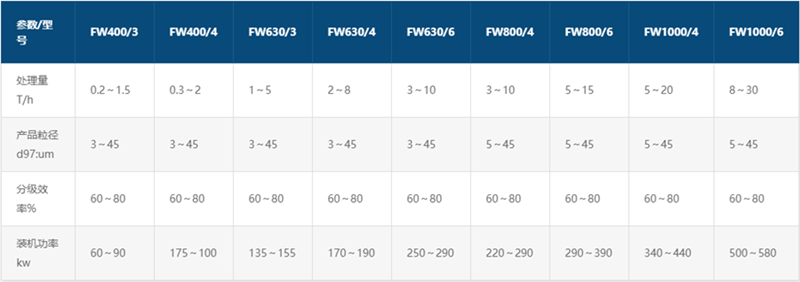 分級機與旋風分離器、除塵器、引風機組成一套分級系統。物料在風機抽力作用下由分級機下端入料口隨上升氣流高速運動至分級區,在高速啊旋轉的分級渦輪產生的強大離心力作用下,使五次物料分離,符合粒徑要求的細顆粒通過分級輪葉片間隙進入旋風分離器或除塵器收集,粗顆粒夾帶部分細顆粒撞壁后速度消失,沿筒壁下降至二次風口處,經二次風的強烈淘洗作用,使粗細顆粒分離,細顆粒上升至分級區二次分級,粗顆粒下降至卸料口排出。