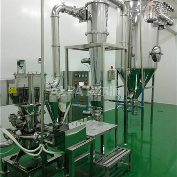 氣流粉碎機(jī)與旋風(fēng)分離器、除塵器、引風(fēng)機(jī)組成一整套粉碎系統(tǒng)。壓縮空氣經(jīng)過濾干燥后,通過拉瓦爾噴嘴高速噴射入粉碎腔,在多股高壓氣流的交匯點(diǎn)處物料被反復(fù)碰撞、磨擦、剪切而粉碎,粉碎后的物料在風(fēng)機(jī)抽力作用下隨上升氣流運(yùn)動至分級區(qū),在高速旋轉(zhuǎn)的分級渦輪產(chǎn)生的強(qiáng)大離心力作用下,使粗細(xì)物料分離,符合粒度要求的細(xì)顆粒通過分級輪進(jìn)入旋風(fēng)分離器和除塵器收集,粗顆粒下降至粉碎區(qū)繼續(xù)粉碎。
